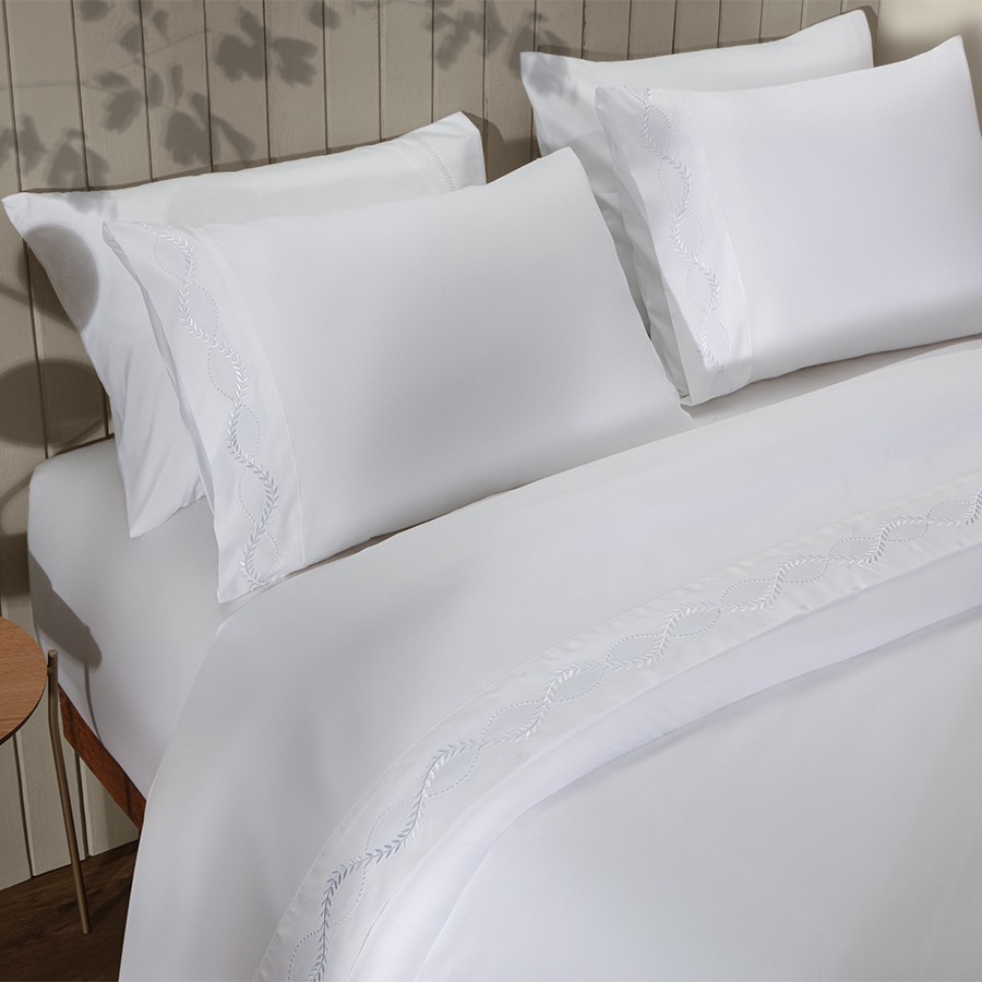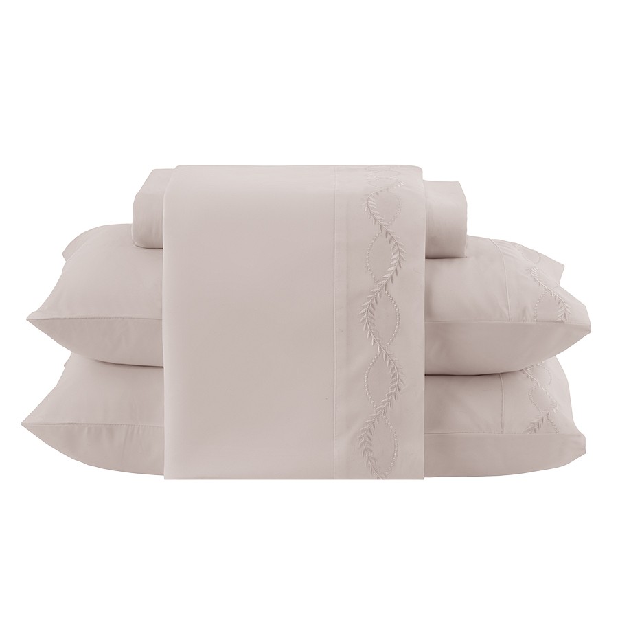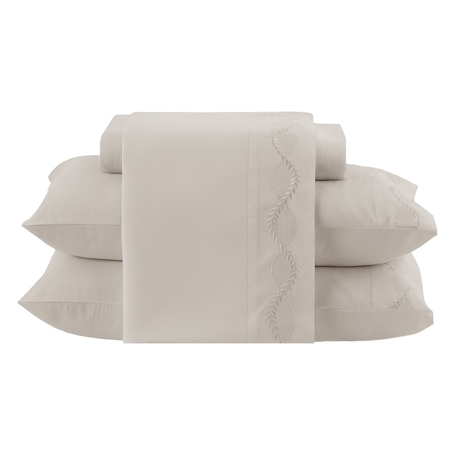 Devido ao seu acabamento em tira bordada, oferece um visual suntuoso para decorar o quarto com toque requintado. O jogo consiste em lençol de cima ricamente bordado na vira, lençol liso com elástico e fronhas com bordados.