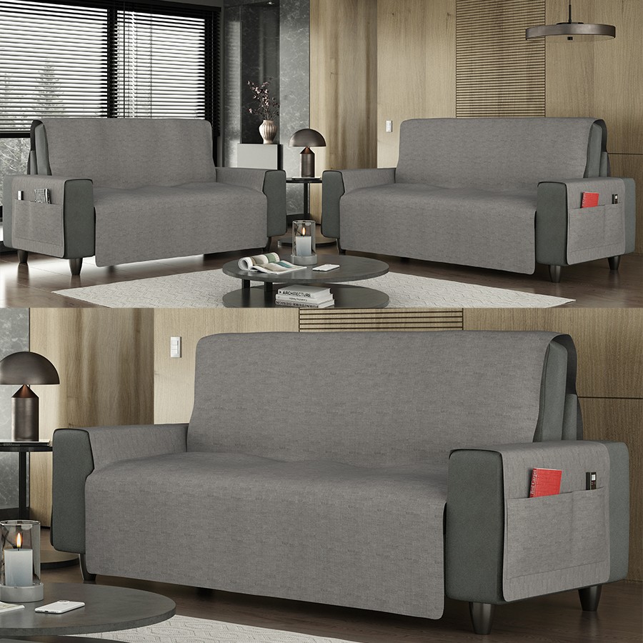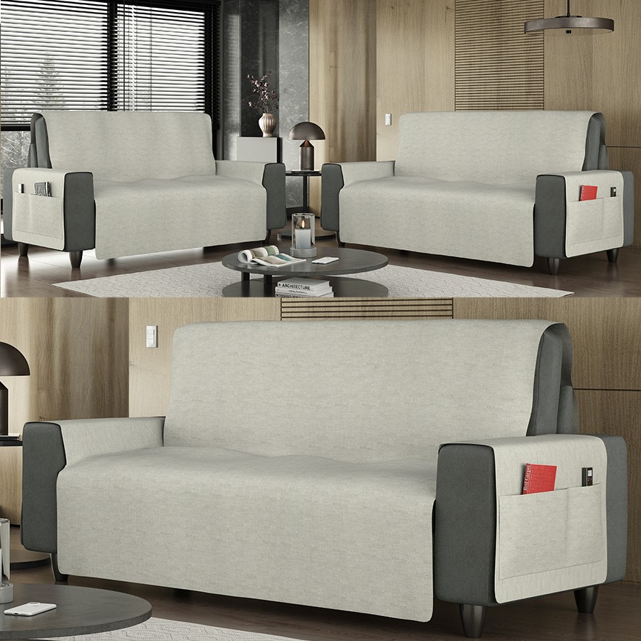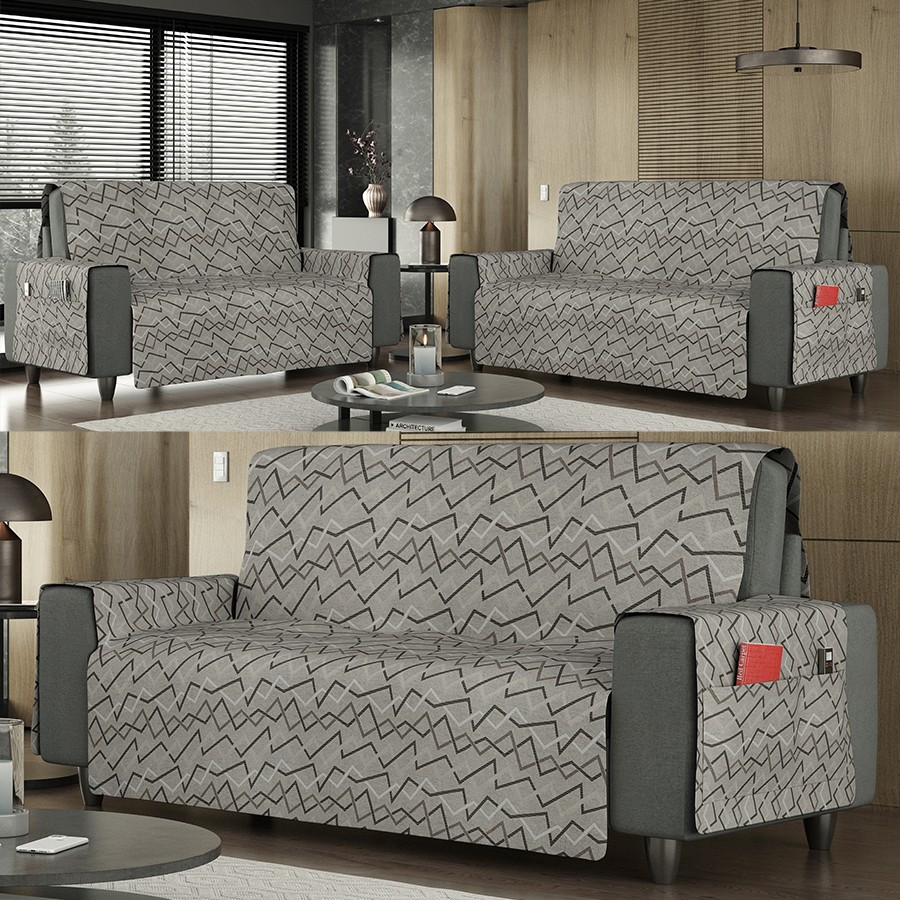 Protetor para sofá de 2 e 3 lugares, confeccionado no tecido jacquard com 5 opções de padronagem. As medidas são adequadas e vestem por completo os assentos, com um ótimo acabamento e garantindo a proteção do sofá. Possui bolsos laterais, ideais para armazenamento de revistas e controles remotos. Bom gosto e qualidade para o ambiente.