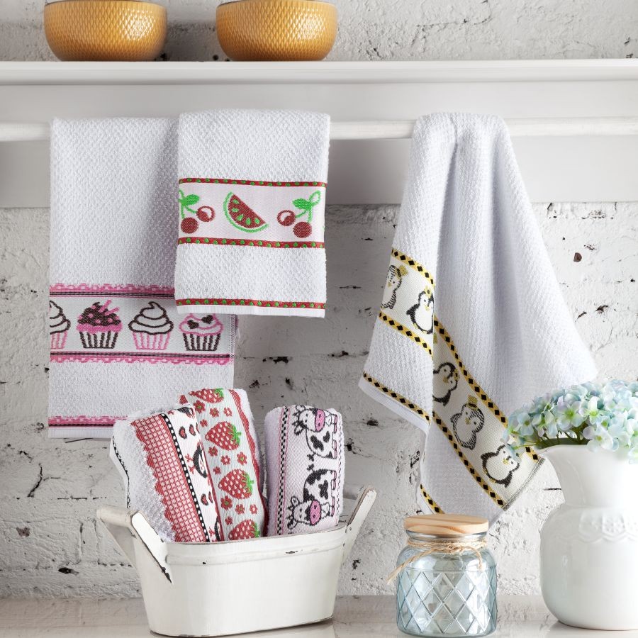 Panos de Copa práticos, com estampas em jacquard sortidas.